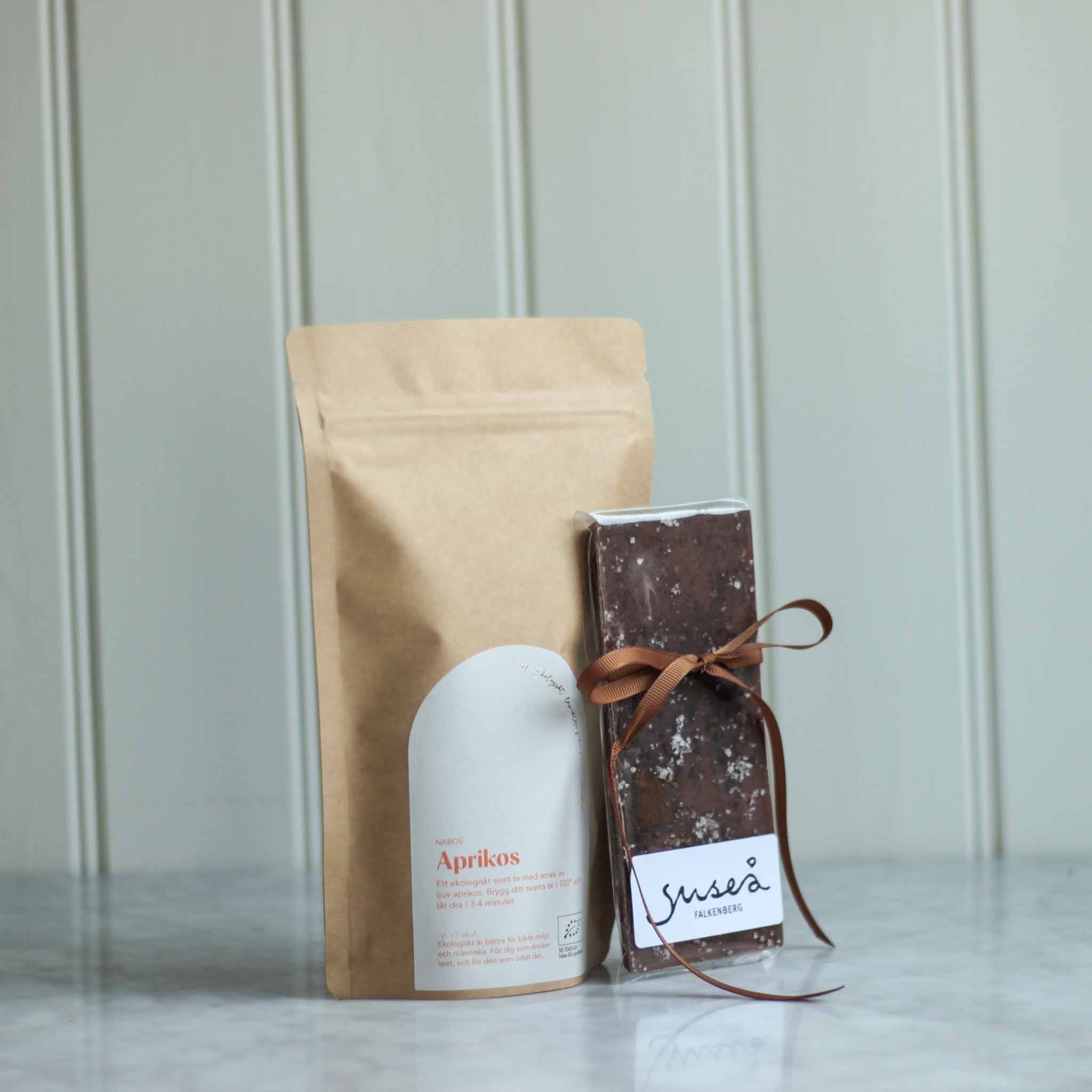 Här har vi ett perfekt presentkit att skicka till någon du unnar något gott: en påse ekologiskt te från oss på Nabo och en härlig chokladkaka från Suseå Choklad. Te och choklad är en så himla bra kombo!